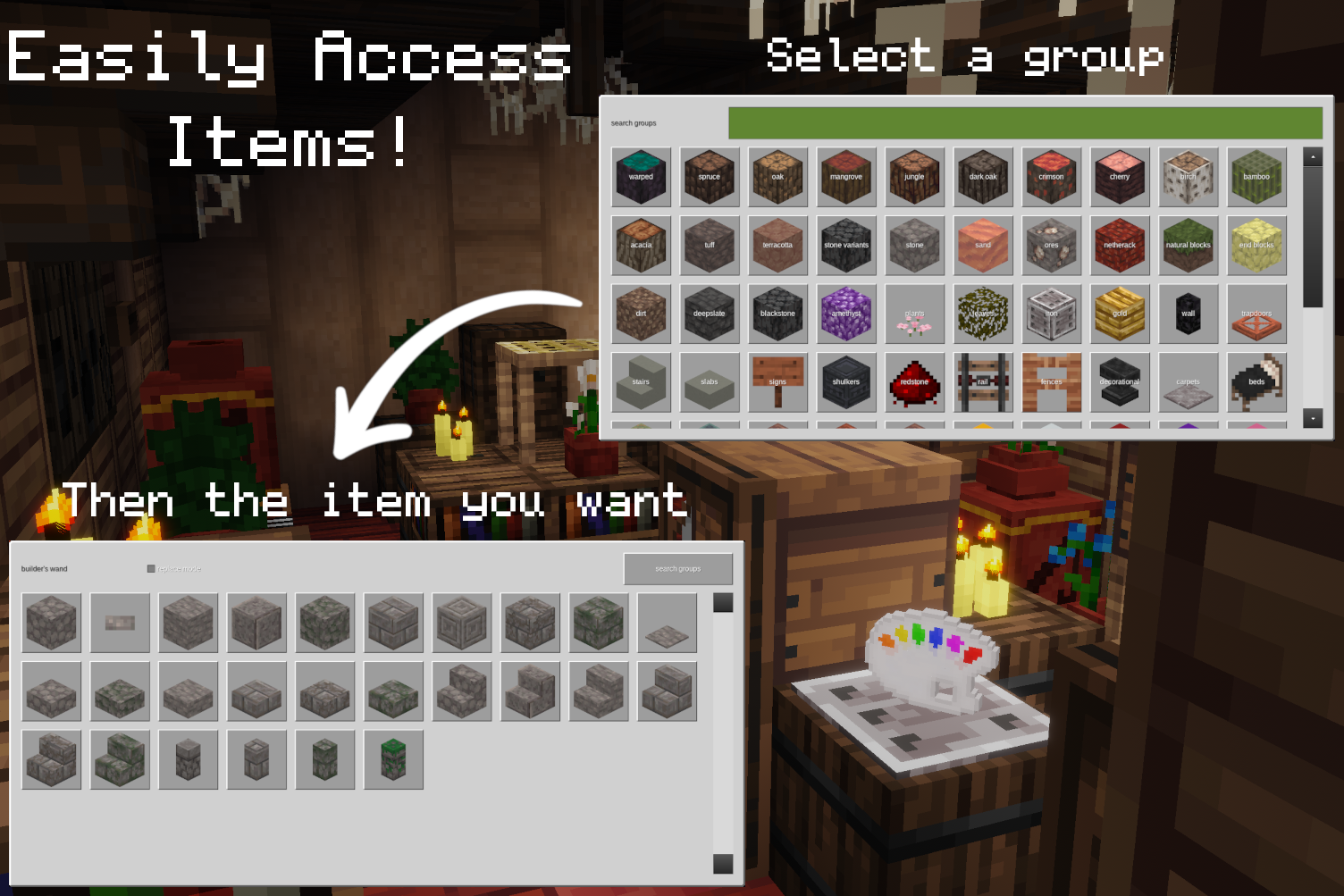 Opens the Group/Item selection menu. You will be shown a list of groups, you can select the group you want or use the search bar to find it. When a group is selected it will show all the items belonging to that group. When you click at a block it will be selected