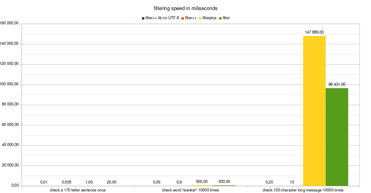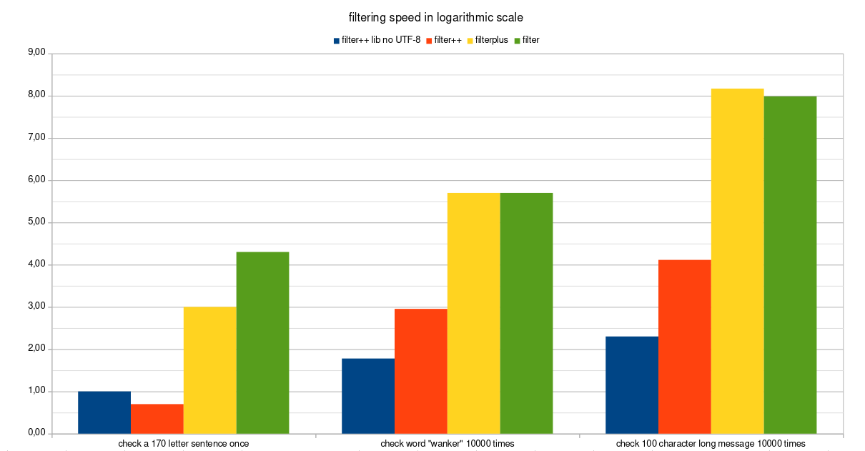 filter++ lib can achieve this time by cleverly arranging its data so checking a word takes O(word_length), unlike filter and filterplus that do it by having a huge list of lua patterns to check in O(word_length * registered_patterns). the downside is that filter++ lib uses more memory than filter (though not more than filterplus, because i don't load a 6MB whitelist)