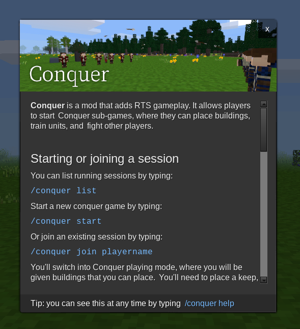 Conquer is a mod that adds RTS gameplay. It allows players to start Conquer sub-games, where they can place buildings, train units, and fight other players.