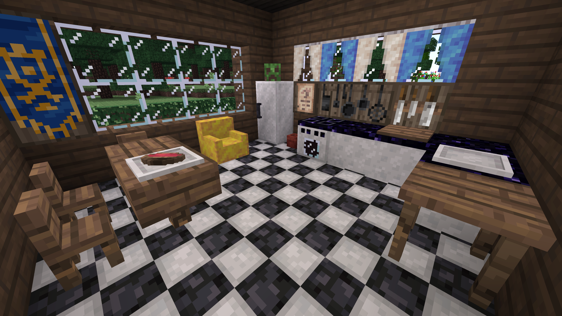 I enjoy the additional elements that make a great-looking kitchen: The oven, fridge, countertops, and checkerboard floor. Also, the chairs and armchairs which you can even sit in! Who needs the outside, now that you have a great kitchen and living room.