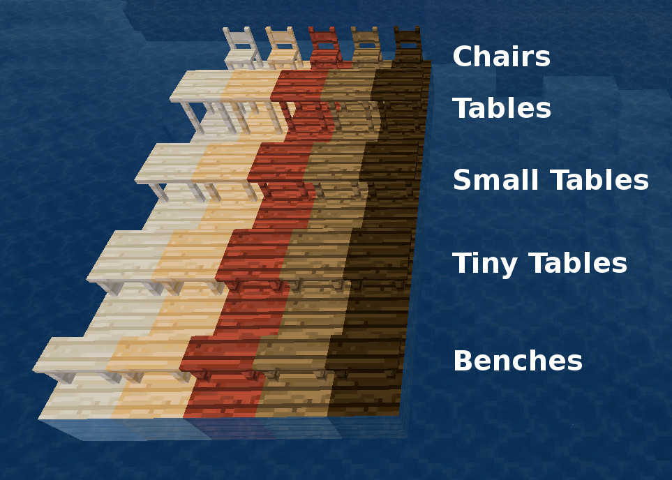 This mod adds basic functional furniture (Chairs, Stools, Tables, Small Tables, Tiny Tables, Benches) to Minetest Game, VoxeLibre, Mineclonia, Exile and other MTG based games.