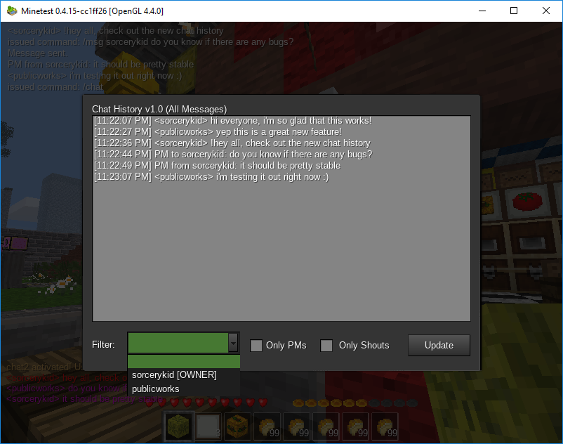 Best of all, since the messages are stored server-side, it is possible to view chat history that occurred prior to logging in, including offline private messages. An alert sound will also play if you receive a private message while logged into the server. No more wading through pages of text just to catch up on any important discussions while you were away!