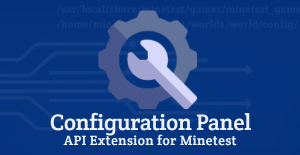Configuration Panel is an API extension for Minetest that allows seamless loading of mod configuration at runtime. It provides much greater flexibility than Minetest's builtin 'Settings' interface, since the mod configuration itself is read as a native Lua script. Hence it's possible to include simple data structures without the need for serialization, in addition to temporary variables, mathematical expressions, and conditional branching.