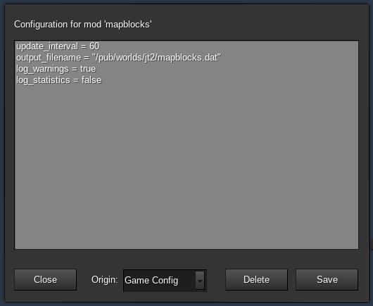 By default, the configuration is first loaded from the 'config.lua' script within the mod directory. If not found, it will instead be loaded from a script residing within the 'config' subdirectory of the current world. That script must be named the same as the mod but with a '.lua' extension, of course.