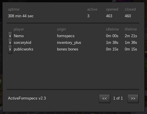 ActiveFormspecs is a self-contained API that provides secure session tracking, session-based state tables, and localized event handling of formspecs for individual mods as well as entire subgames in Luanti. It evolved out of a recurring need for secure "node formspecs" on my server, but without the burden of "reinventing the wheel" with every new project. ActiveFormspecs adheres to the best practices described in sofar's excellent Securing Formspec Code topic.