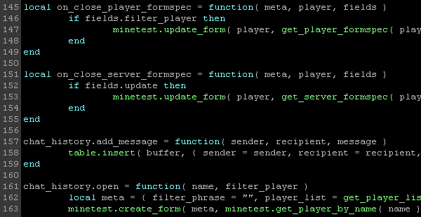 core.register_on_player_receive_fields( )method has also been deprecated. Instead, each formspec is assigned its own callback function at runtime, which allows for completely localized event handling. This callback function is invoked after any event associated with the formspec (hence the moniker "ActiveFormspecs"). Both the meta table and form fields are passed as arguments.