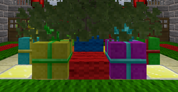 By opening a present, a visual greeting will appear with a single inventory slot containing the preset item. After the item is taken from the inventory, then the present will be deleted from the world automatically.