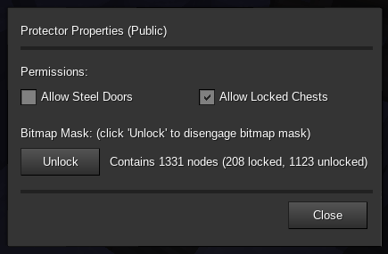 The bitmap mask of shared protectors can be manually engaged or disengaged by right-clicking the protector and clicking "Lock Area" or "Unlock Area" respectively. Locking the area stores a "snapshot" of all non-air and non-liquid nodes as a bitmap into the metadata of the protector (compressed for space efficiency) . For public protectors, the bitmap mask is automatically engaged at all times.