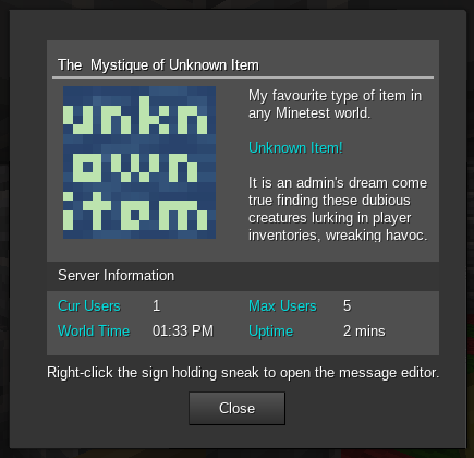 I completely rewrote default signs as a standalone mod with many new features! It's now possible to view the full text of a sign within a custom sized and colored formspec combined with an advanced markup language specifically tailored for Minetest formspecs with simple-to-use tags for layout and formatting (i.e. color, header, border, rows and columns, etc.) and builtin word-wrapping within all cells.