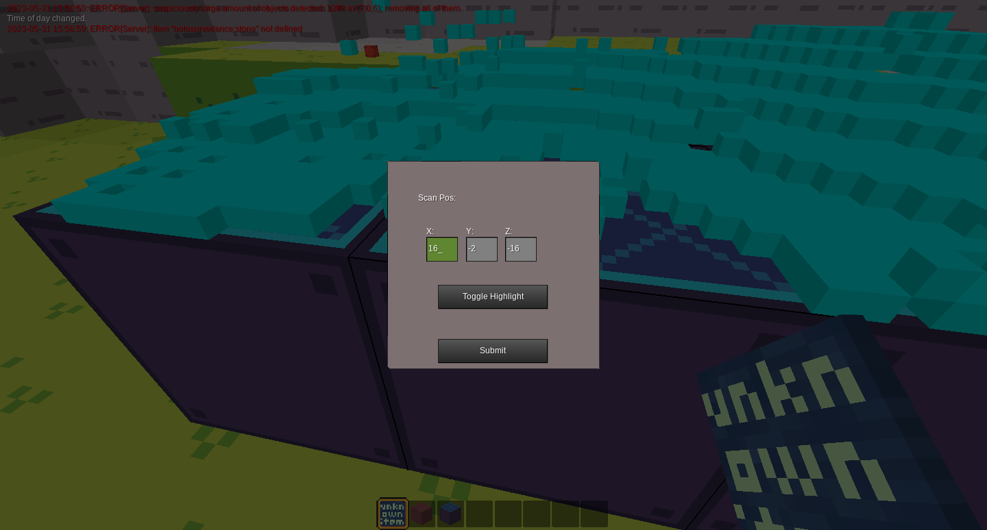 Provides one new node (holosurveilance:holo) when placed this block will display the heightprofile and all players(red cubes) of a region with 16x16x16 dimensions. The lower corner(min x, min y, min z) of this region can be defined by rightclicking the block, these coordinates are relative to the position of the block and aligned to world coordinates so it doesnt matter how the block is facing.