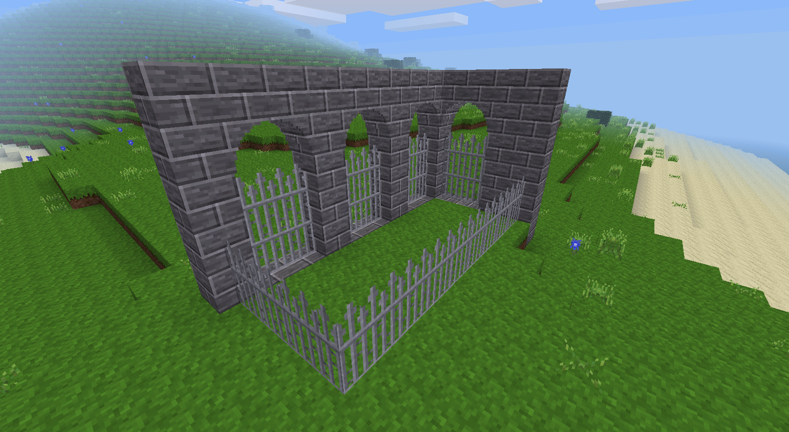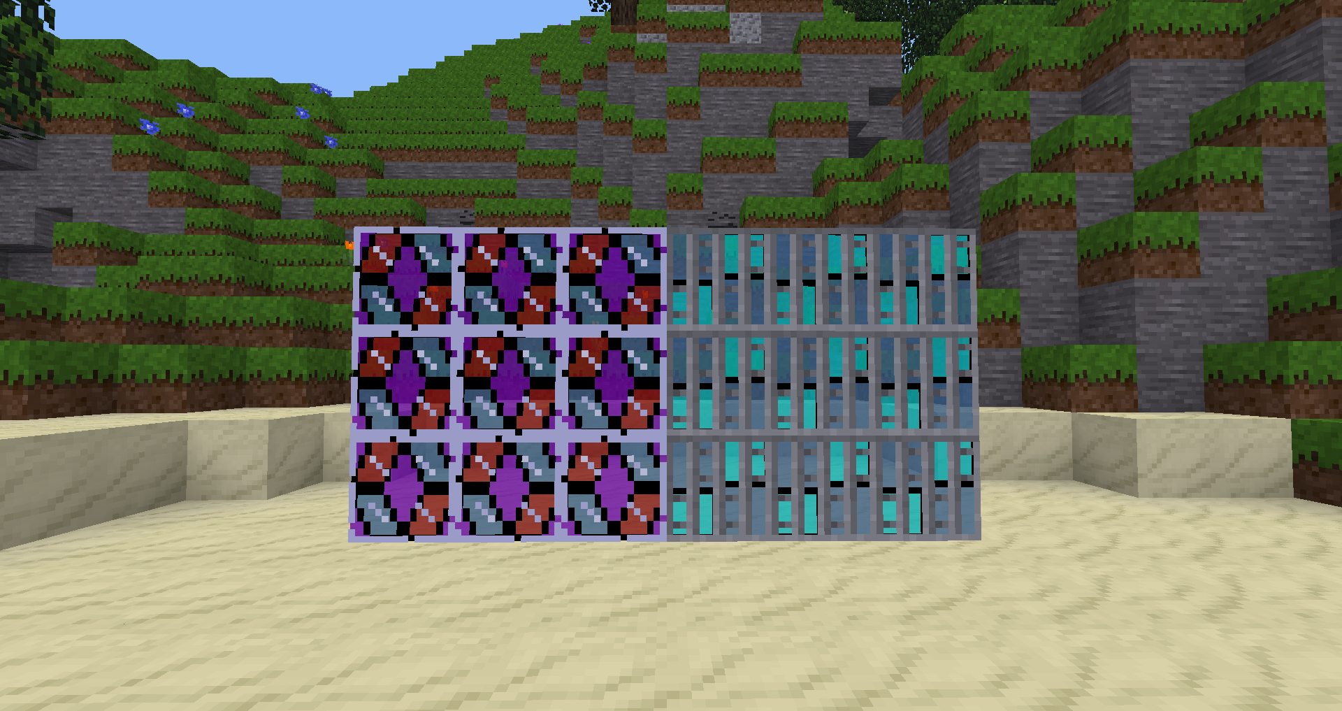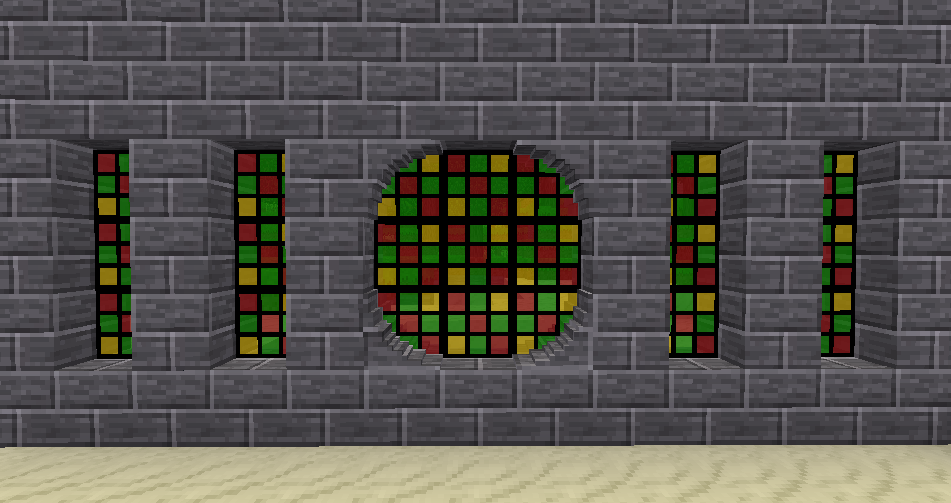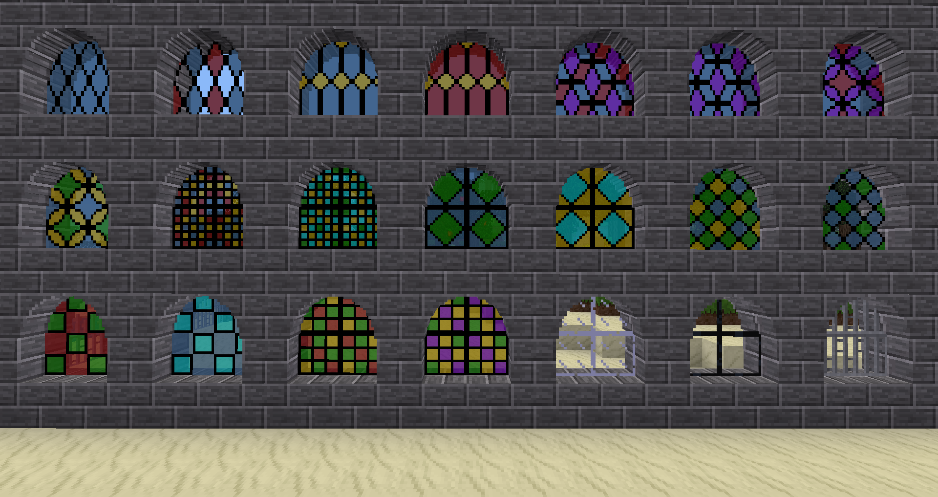 Adds stained glass of many different fancy designs, making wonderful looking windows. Each glass type comes in six different shapes that can be partially embedded inside other nodes, like arches or upside-down stairs. In addition, these shapes also have glass and obsidian glass variants, allowing normal glass to be embedded as well. Finally, it adds spiked iron railing that makes for great courtyard boundaries.
