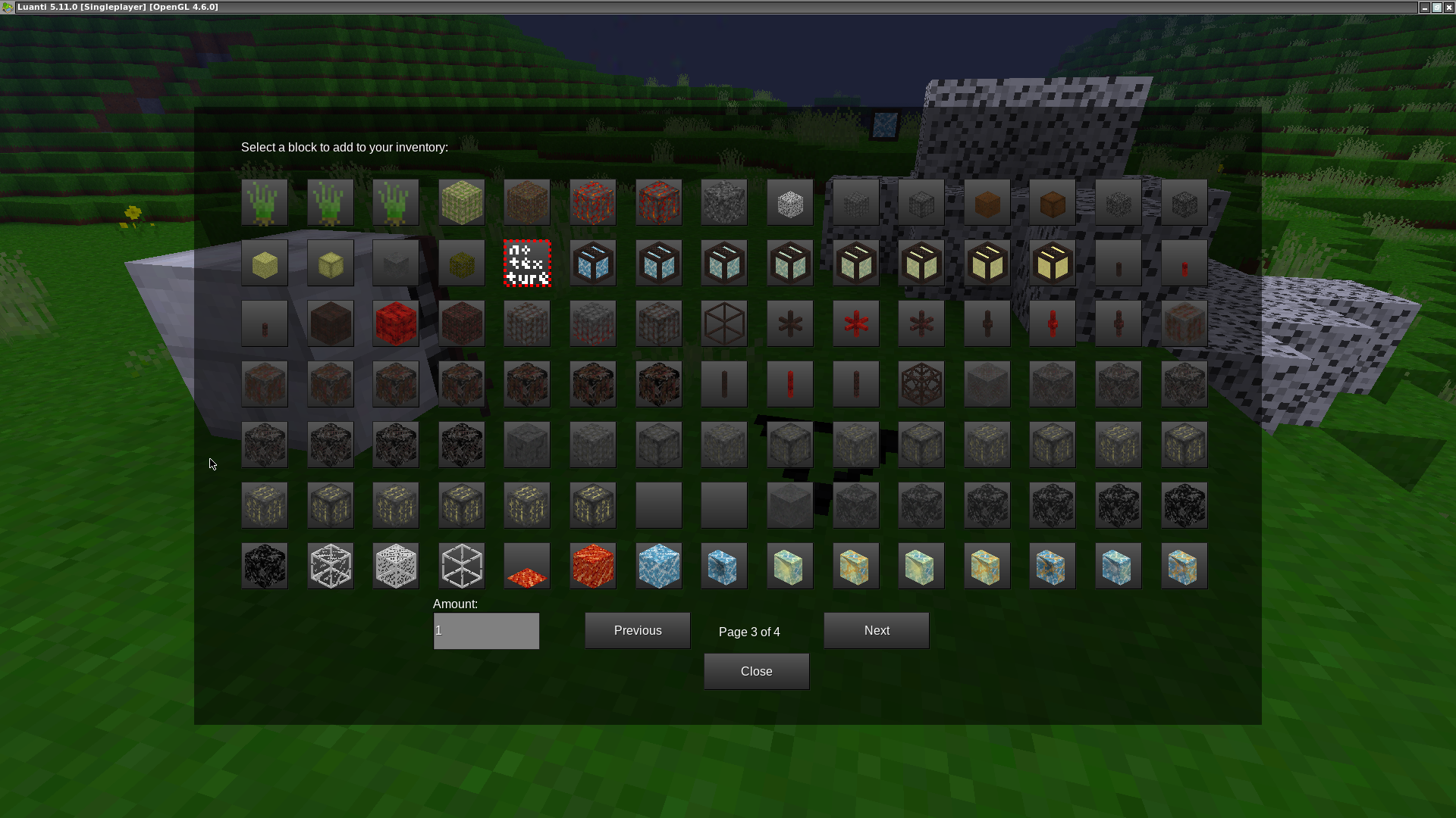 Gives the player access to a menu that lists all registered nodes giving the player full access to any block they want to use for building without having to go through unility blocks (like a form of crafting table) to access these blocks. This is mainly meant for creative mode and adds a way to get blocks eaisly in games that dont have a proper inventory system like nodecore.
