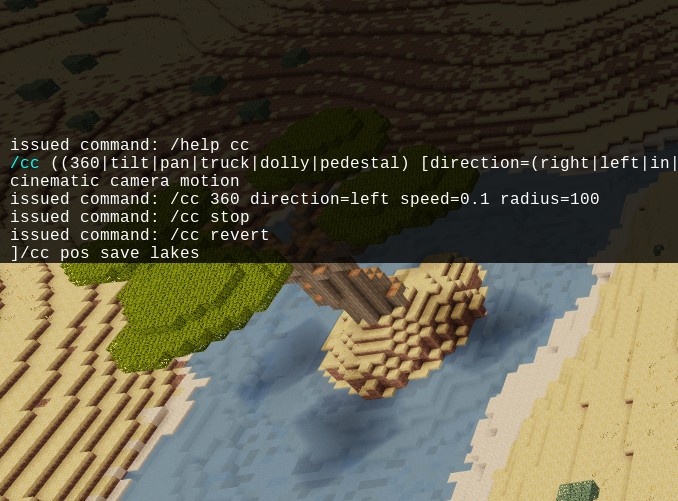 All commands are placed under /cc command which stands for cinematic camera. Running the commands requires fly privilege (they don't make sense without it anyway).