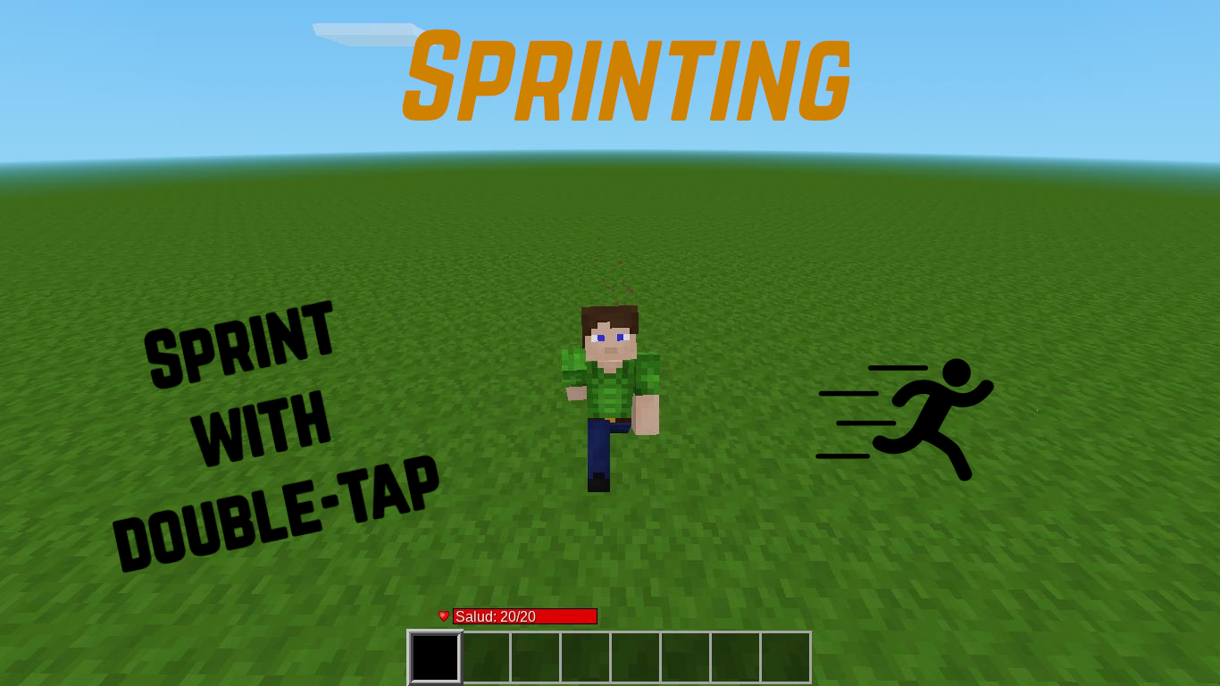 Get anywhere faster by running. The sprint mechanic is something essential in open-world games like Minetest. So, here is the mod that allows just that: Sprinting. Sprint by double-tapping the forward key (usually W) or using Aux1 key (default E). When you are sprinting, you get faster, your Field of View changes and ground particles begin to appear behind you. Also, you jump a little higher.