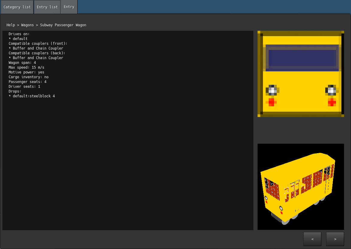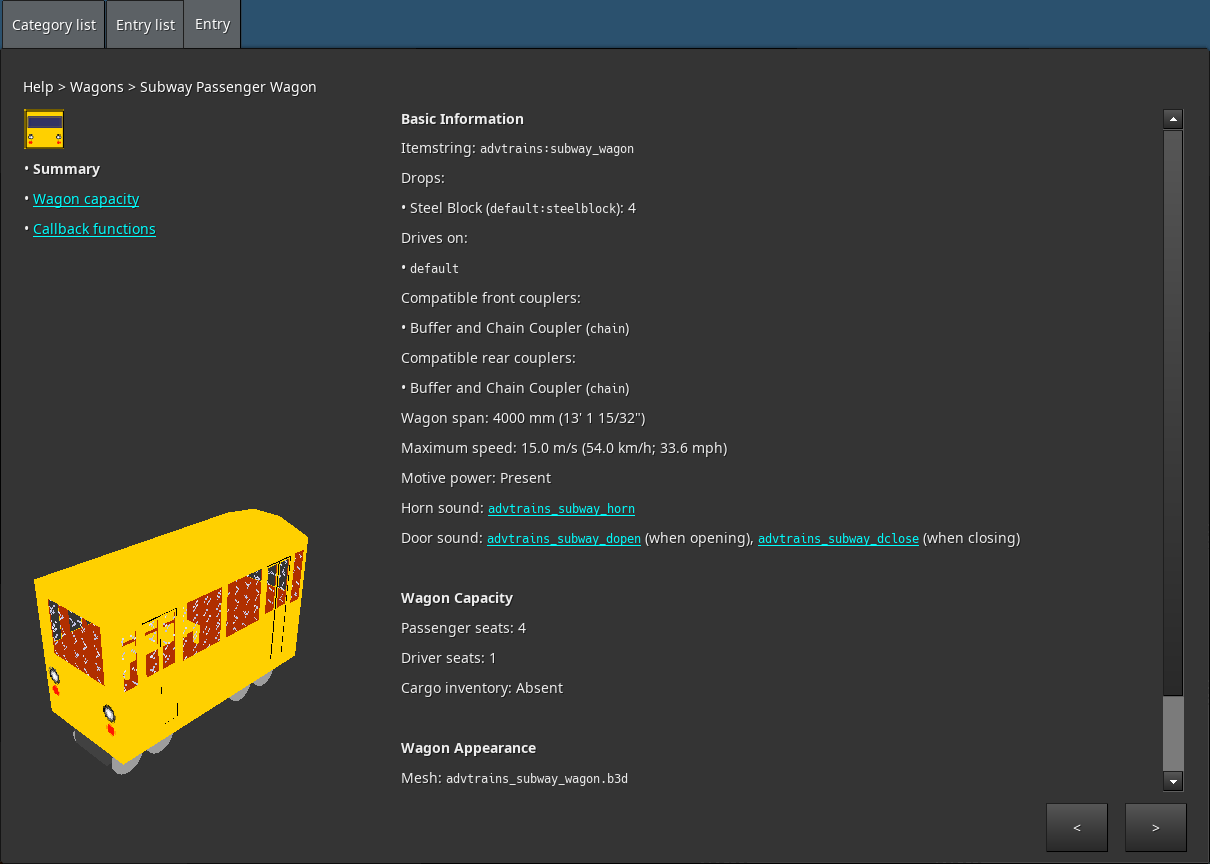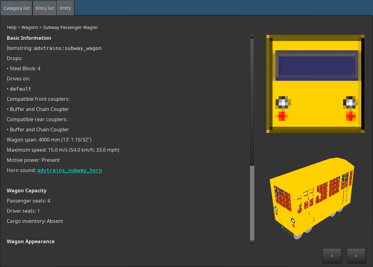 While the presentation is kind of a wall of text, in-game presents the best place that this information could be provided. While the AdvTrains train catalogue tries to do its best at providing information on all train content that is available, it is subject to becoming out of date as well. With this mod installed, the information is generated from the actual data of the train as it was registered with AdvTrains, making it impossible for it to be out of date.