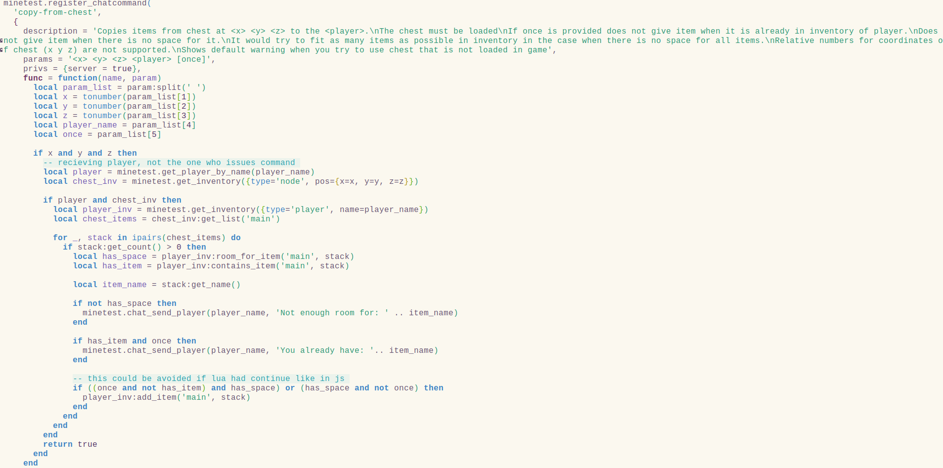 Adds server command copy-from-chest <x> <y> <z> <player> [once].
