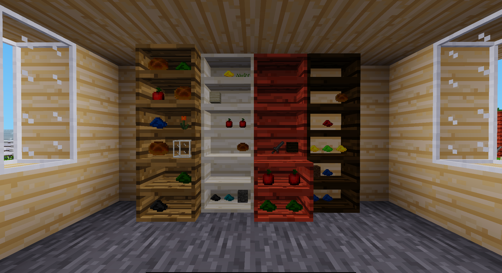 The item shelf mod is a simple mod that adds to shelves that can hold up to 4 or 6 items. This small limitation is due to the fact that shelves show the items they are holding using entities. The entities are purely static and consume 0 CPU (like the ones in itemframes for example), but still the limitation is to avoid lag.